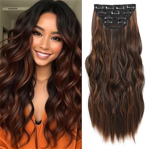 Clip In Hair Extensions Long Wavy Hair Extensions 4PCS Medium Brown Highlighted Blonde Clip Ins For Women Thick Full Head Synthetic Hairpieces