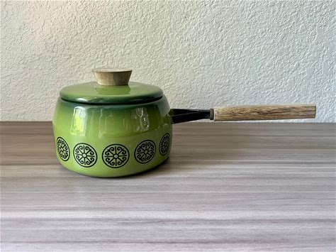 Vintage Finel Avacado Green Enamel Pans 1970S Raja Uosikkinen Design Cookware Enamelware Danish Mid Century Curvy Fondue Pot