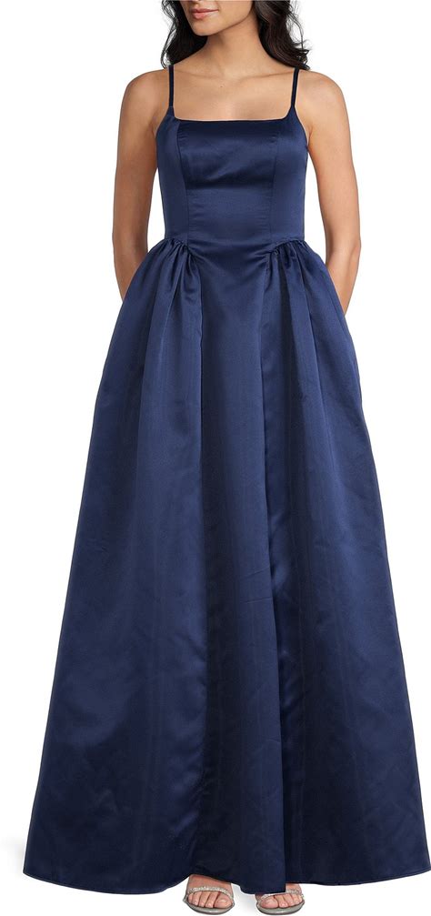 Dear Moon Satin Basque Waist Square Neck Spaghetti Straps Long Dress, Womens, 11, Navy