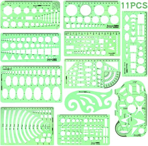 Qincling 11 Pieces Geometric Drawings Templates Stencils Plastic Measuring Template Rulers Clear Green Shape Template For Drawing Engineering Drafting