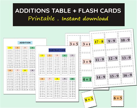 ADDITION & SUBTRACTION TABLE Chart Printable With Flash Cards, Printable Table Chart Poster, Homeschool Math Lesson Worksheet Math Poster