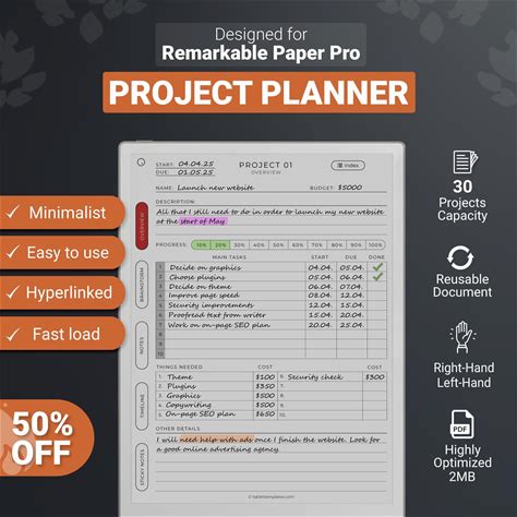 Project Planner For Remarkable Paper Pro Tablet, Undated, Hyperlinked PDF Template