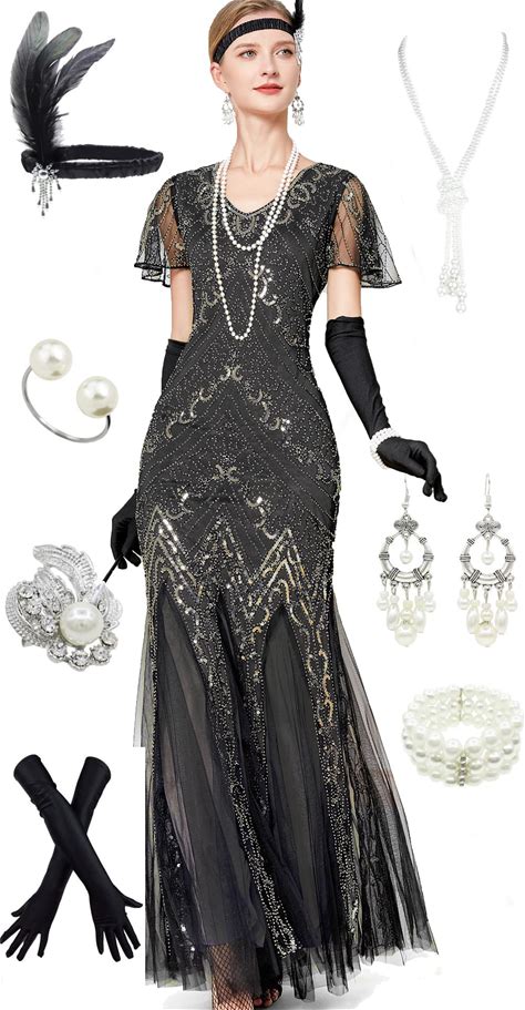 1920S Short Sleeve Sequin Gatsby Maxi Long Evening Prom Mesh Mermaid Hem Dress W/ 20S Gatsby Accessories Set