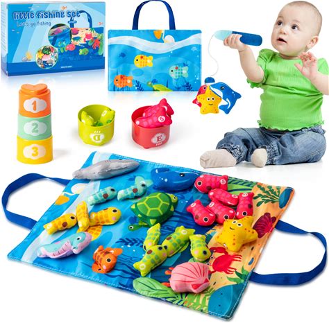 GQIRIL Montessori Toys Fishing Game - 28PCS Cloth Fish Shark Ocean Toy With Stacking Cups For 2 Year Old Toddlers 2-4, Learning Number Counting, Color