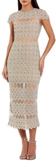 Mac Duggal Beaded Mesh Fitted Midi Dress With Sheer Panels In Ivory Nude At Nordstrom, Size 12
