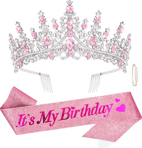 CURASA Birthday Sash And Crown For Women Pink Birthday Crown Tiara Adult Women Princess Crown Pink Decoration Party Favors Gifts